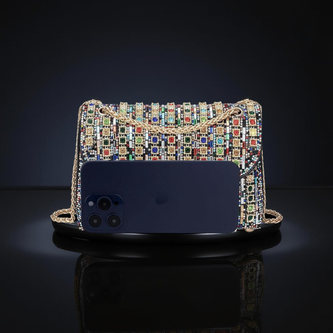 The Gilded Prism Bag is a show-stopping piece adorned with rows of multicolor crystals that sparkle with every move. A fusion of bold color and refined craftsmanship, it’s the perfect accessory for statement nights, parties, or anywhere you want to shine brighter than the crowd.